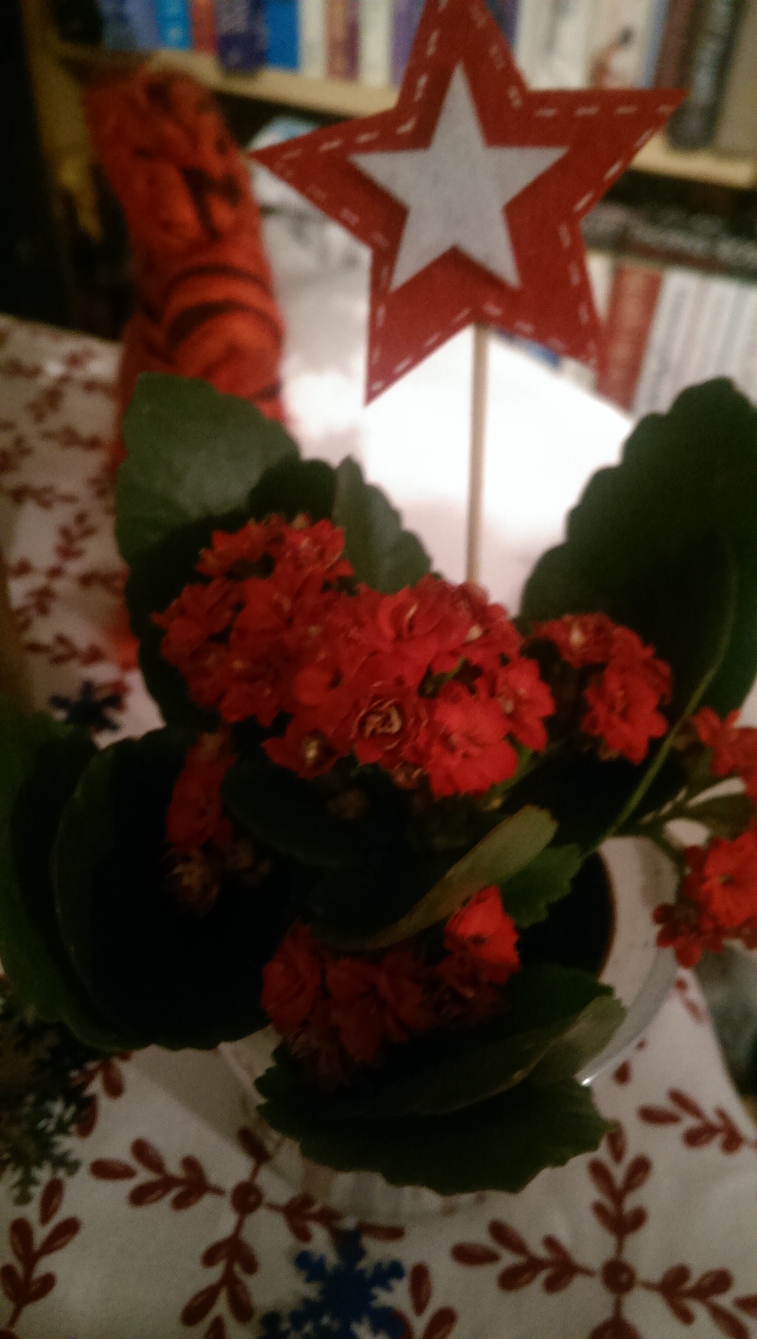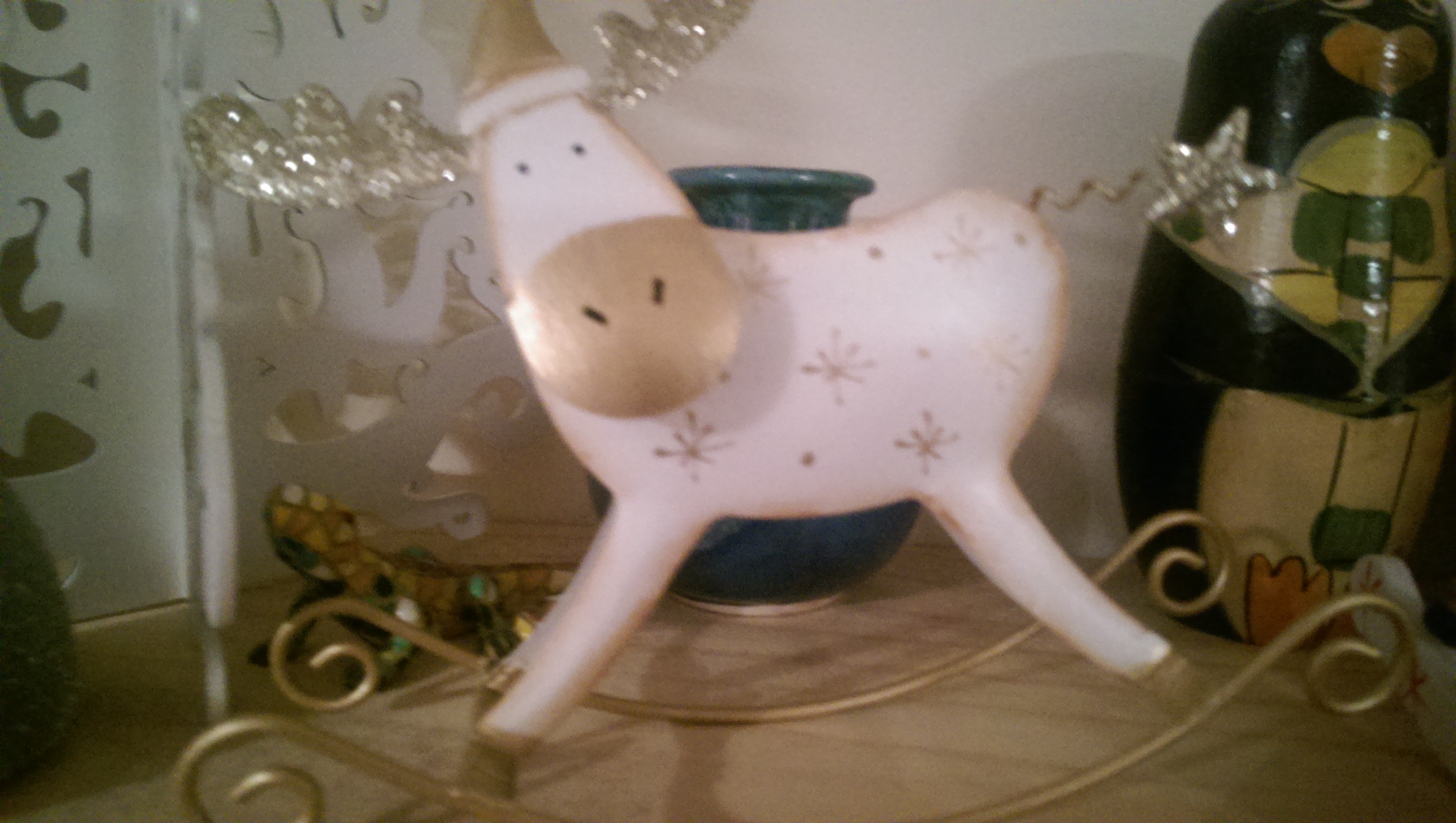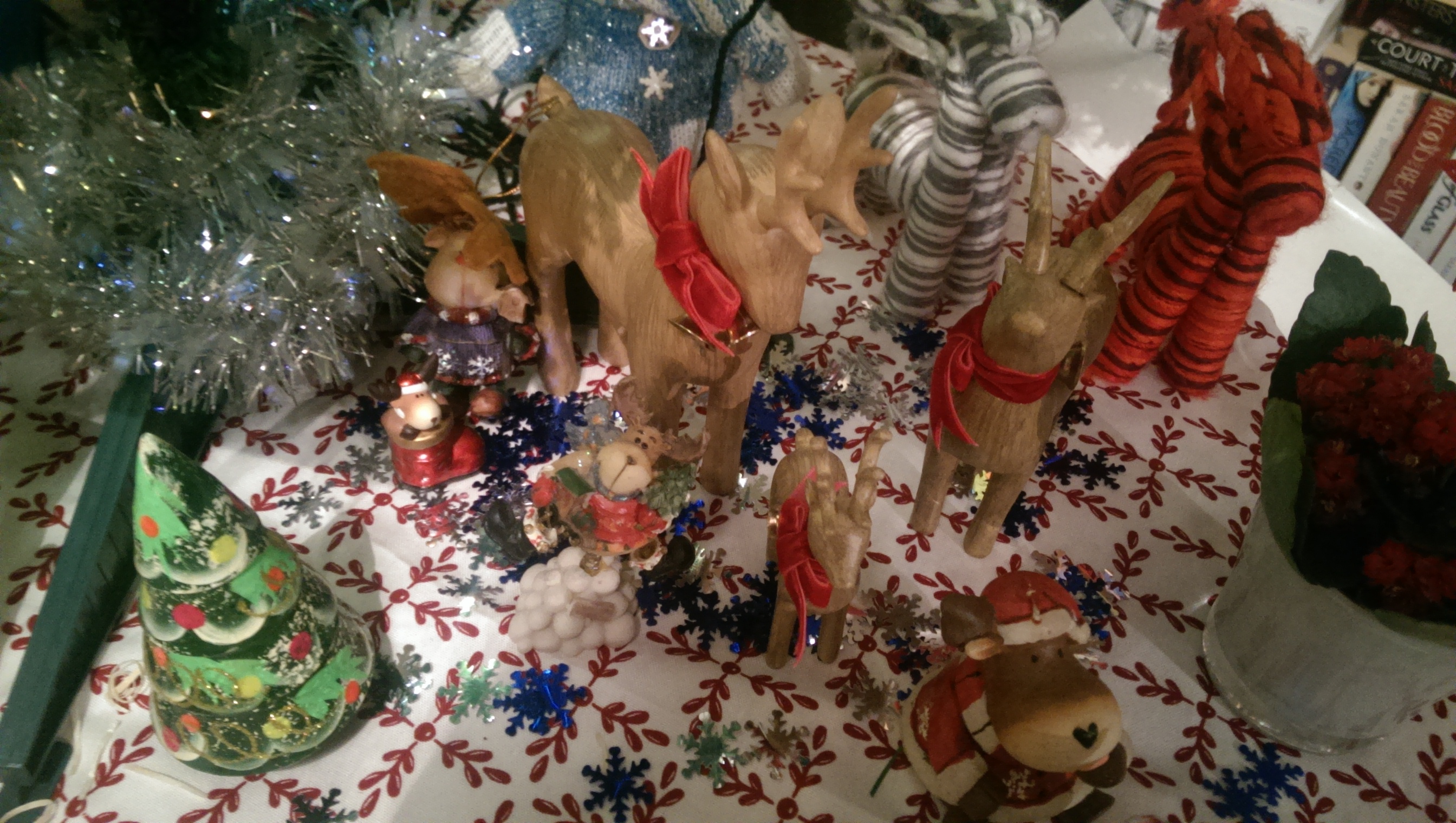 We have a mix of traditional and contemporary decorations. There’s a Nativity scene and a herd of reindeer, Santas and angels. We’ve even got our first few cards up.