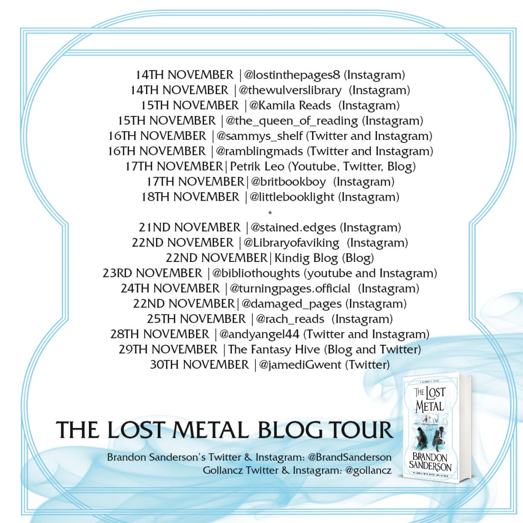 Which means saying goodbye to this set of characters – Wax, Wayne, Steris, Marasi and the others will go on but not feature again. Some will, since gods and kandra are immortal, I imagine a few will appear here and there, but not the human ones. The Lost Metal is a fantastic, high stakes, ending, full of all of the adventure and chaos you want. And while we wait for the Third Era, time to read the whole series so far, again!