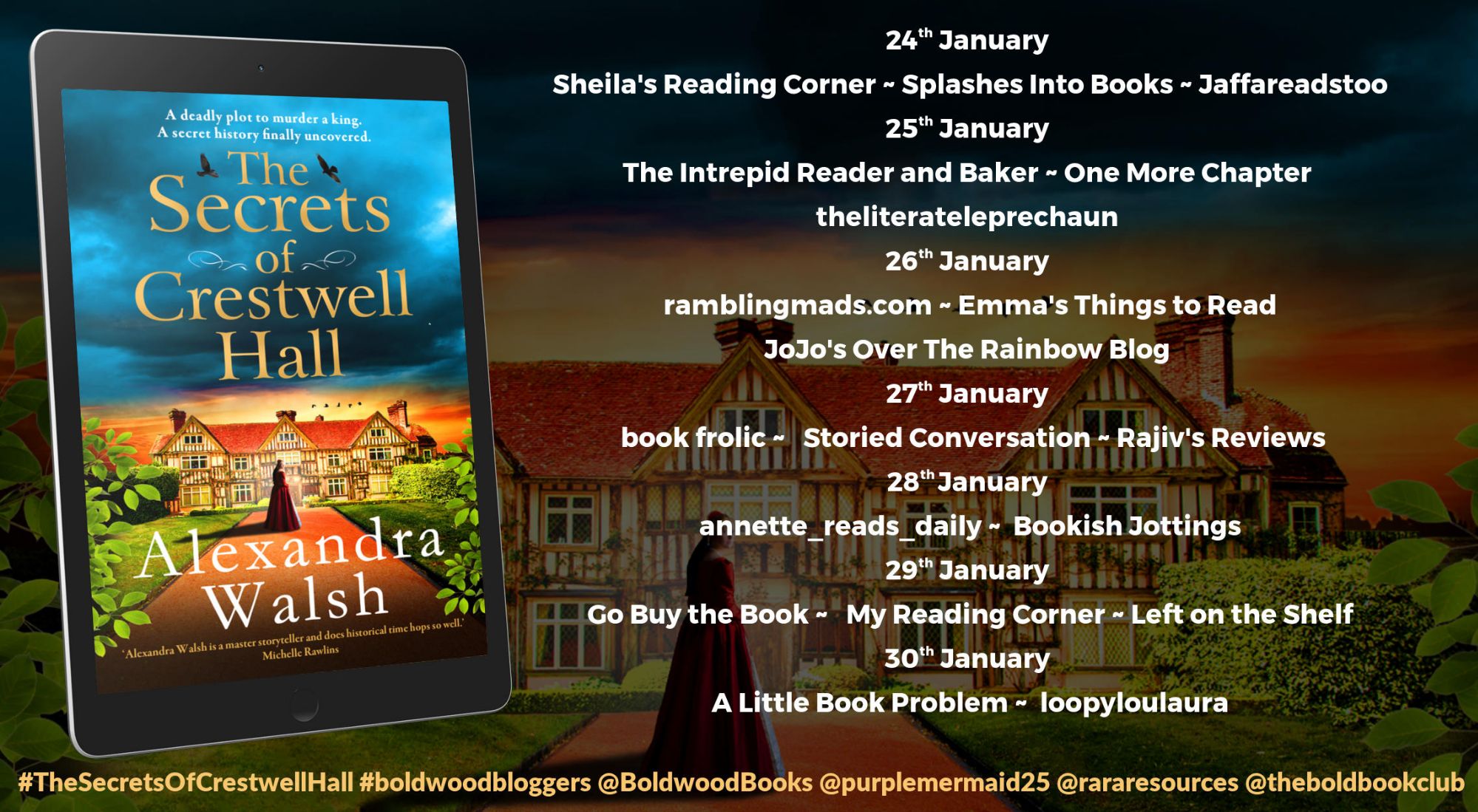Present Day; Isabella Lacey and her daughter, Emily, are excited to be starting a new life at her aunt’s home,Crestwell Hall in Wiltshire. During renovations, Isabella discovers an ancient bible that once belonged to Bess Throckmorton, and to her astonishment finds that it doubled as a diary. As Isabella reads Bess’s story, a new version of the Gunpowder Plot begins to emerge-told by the women.When Emily’s life is suddenly in terrible danger, Isabella understands the relentless fear felt by Bess, hundreds of years ago. And as the fateful date of 5th November draws ever closer, Bess and the plotters’ wives beg their husbands to stop before a chain of events is set into action that can only end one way…