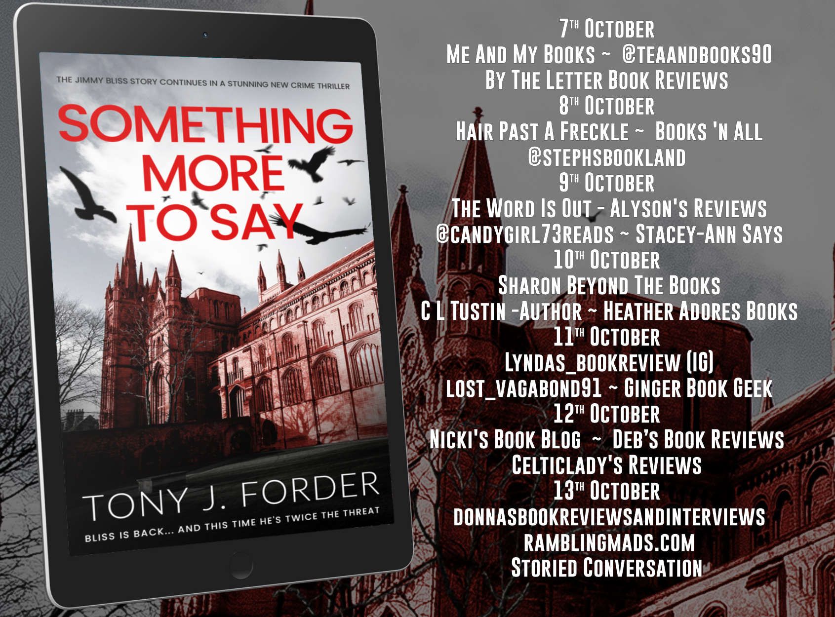 Tony J Forder is the author of the bestselling DI Bliss crime thriller series. Bad to the Bone, The Scent of Guilt, If Fear Wins, The Reach of Shadows, The Death of Justice, Endless Silent Scream, Slow Slicing, The Autumn Tree, Darker Days to Come, The Lightning Rod, and What Dies Inside Us will be joined in autumn 2024 by Something More to Say. There is also a prequel novella available called Bliss