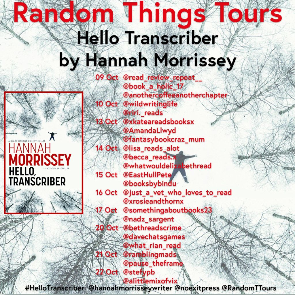 Between roles of bookseller and copywriter, Hannah was inspired to write her debut novel while transcribing reports for her local police department. Far from home in a grim, crime-ridden city, it was her job to sit alone in the dead of night, listen, and type as detectives divulged the city’s darkest secrets. There, she realized that every case was a story, and every story started with the same two words: ‘Hello, Transcriber.’