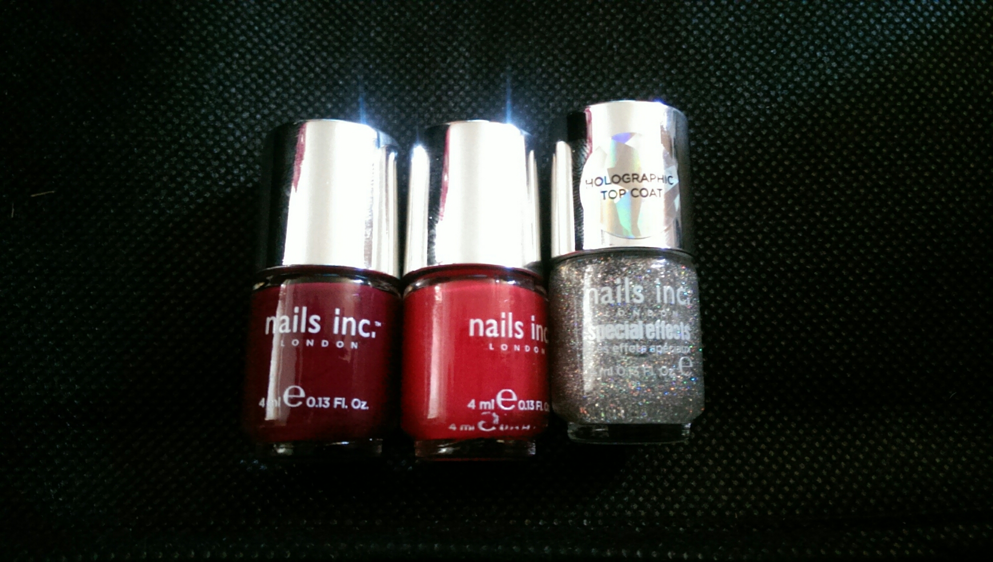 Left: Rimmel 60 Seconds in Caramel Cupcake, Middle: Essie multi dimensional top coat, Right: Nails Inc Gel Effect in Kensington High Street